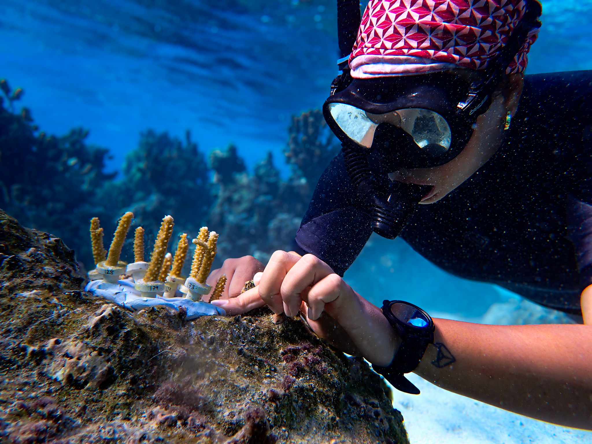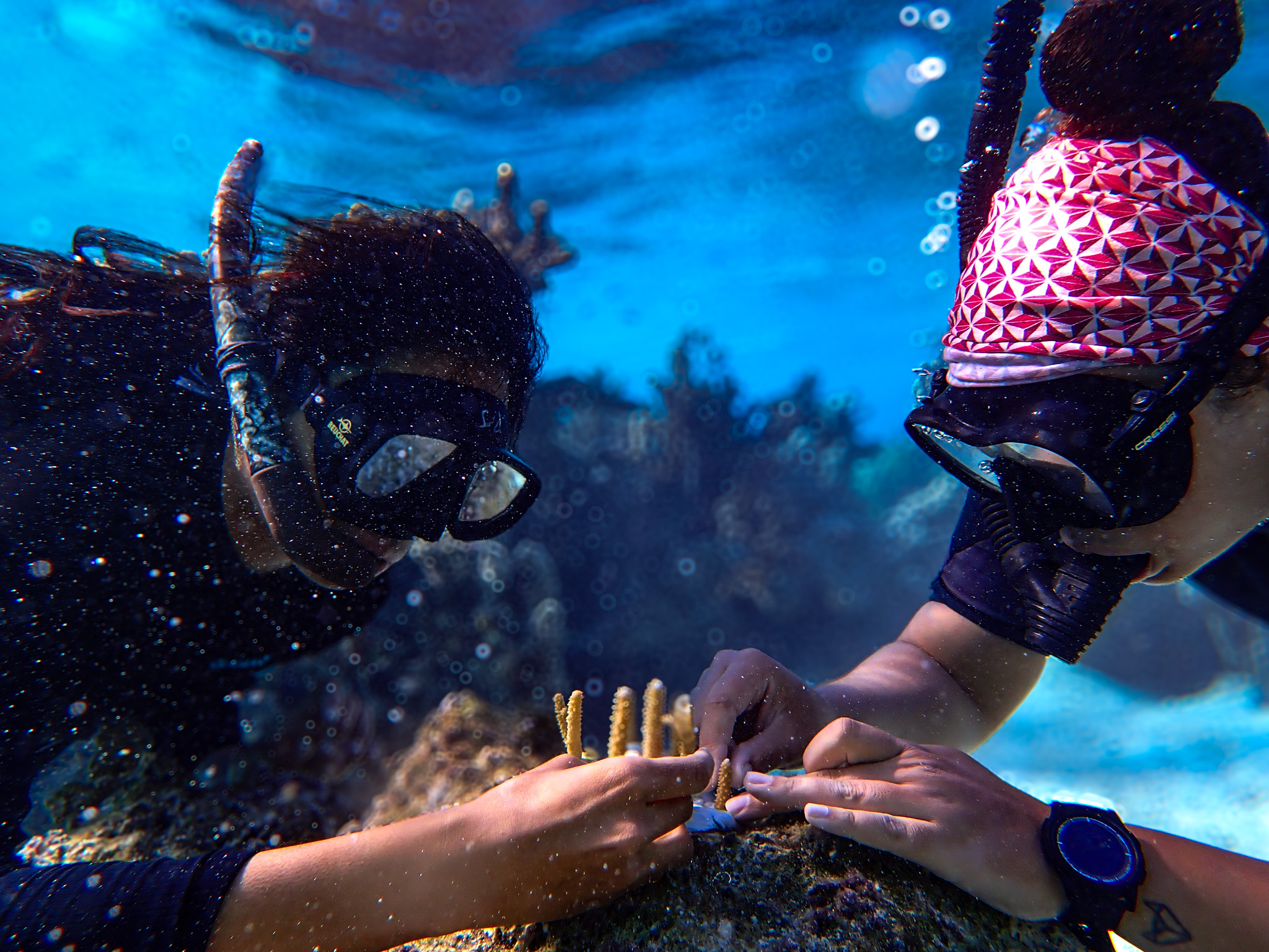 Auhurra and her other mentor, Olivia, outplanting corals.