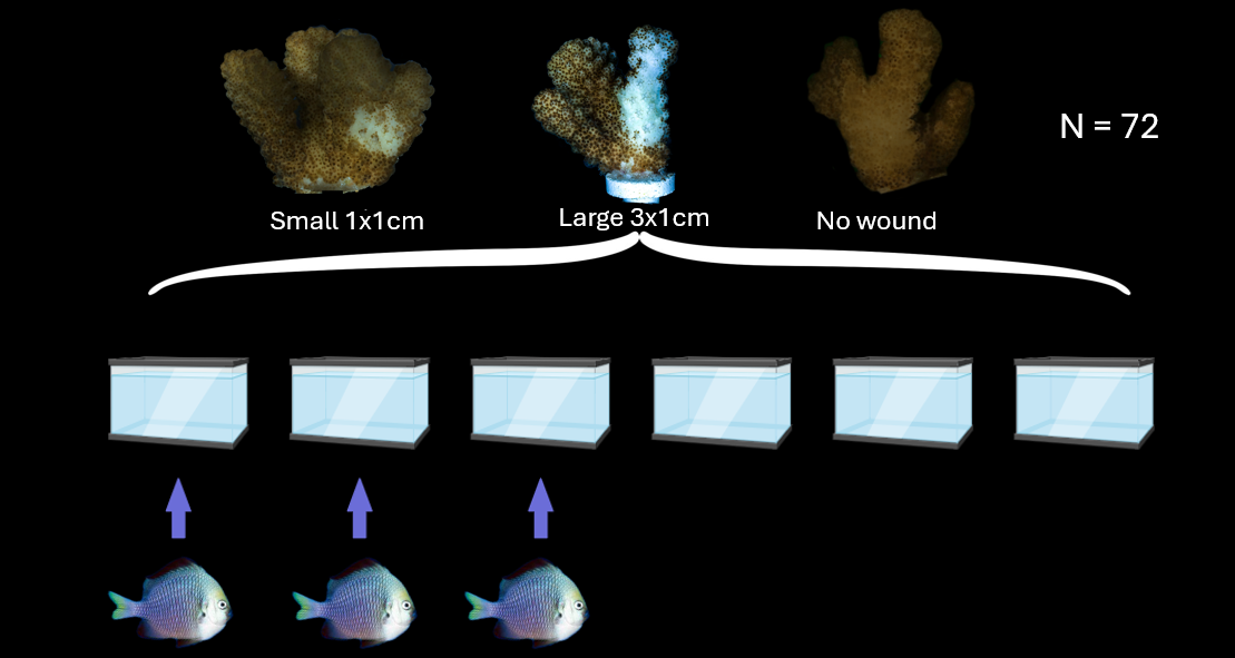 Our experiment is interested in elucidating how coral health changes as a function of wounding intensity and fish presence. We studied this relationship in a tank experiment. We collected 72 Pocillopora sp. corals and gave them either no, small, or a large wound. We then spread equal numbers of each wounding treatment into six tanks (12 corals/tank). Thirty grams of the coral sheltering fish, the Yellowtail Dascyllus (Dascyllus flavicaudus) was added to half of these tanks, creating six unique treatments. Corals were housed in treatment tanks for five weeks, and all physiological data was collected at the end.