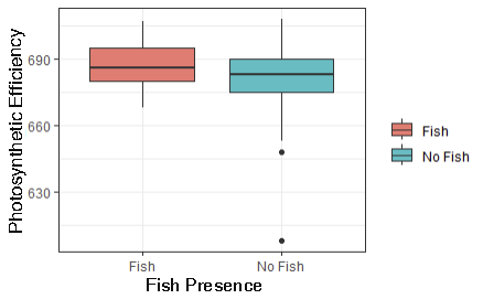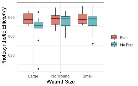 To address our question, we first qualitatively observed the data to inform our later analysis. Then we used randomized hypothesis testing against a null model to form conclusions about the interaction of wounding intensity and fish presence on photosynthetic efficiency. Specifically testing the hypotheses of whether or not there was a difference in growth, photosynthetic efficiency, or healing rate across and among treatments. For treatments that showed a distinct pattern, we created a generalized linear model to characterize the effect.