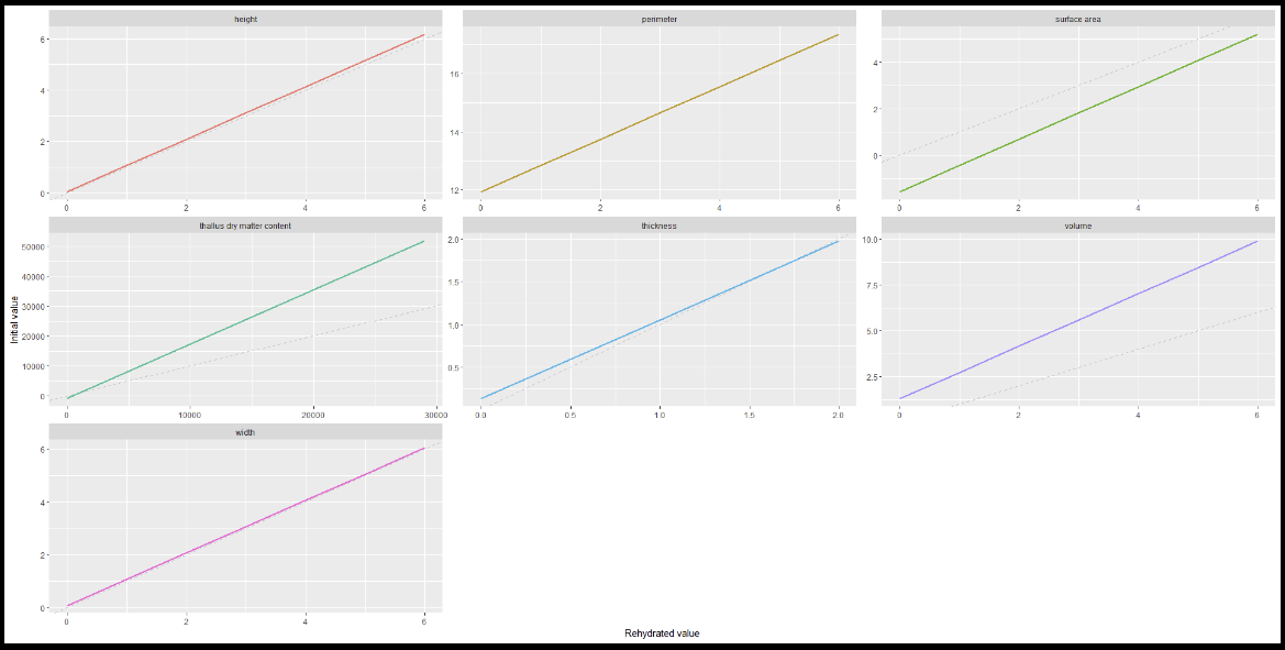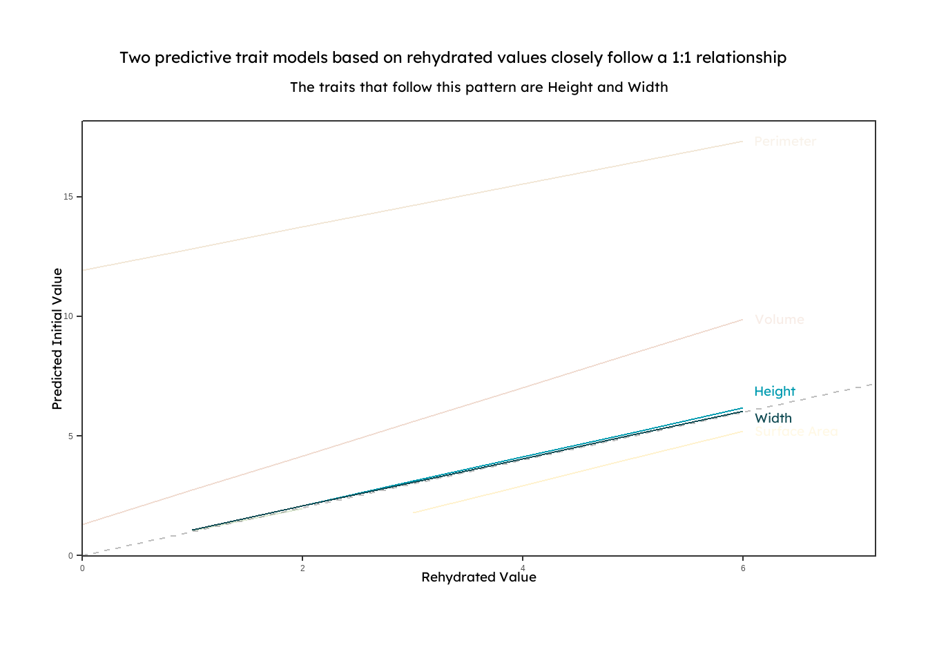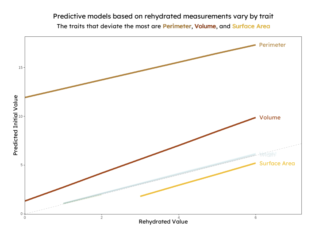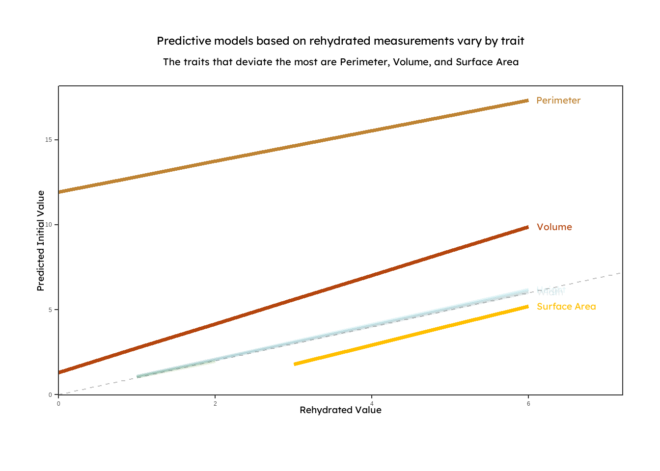 {group="finalviz" description="A line graph displaying linear models that predict initial functional trait measurements based on rehydrated preserved seaweed. The models for perimeter, volume, and surface area are highlighted to show that they do not follow a 1:1 relationship between initial and rehydrated measurements. This suggests that predictive models are unique to each trait."}