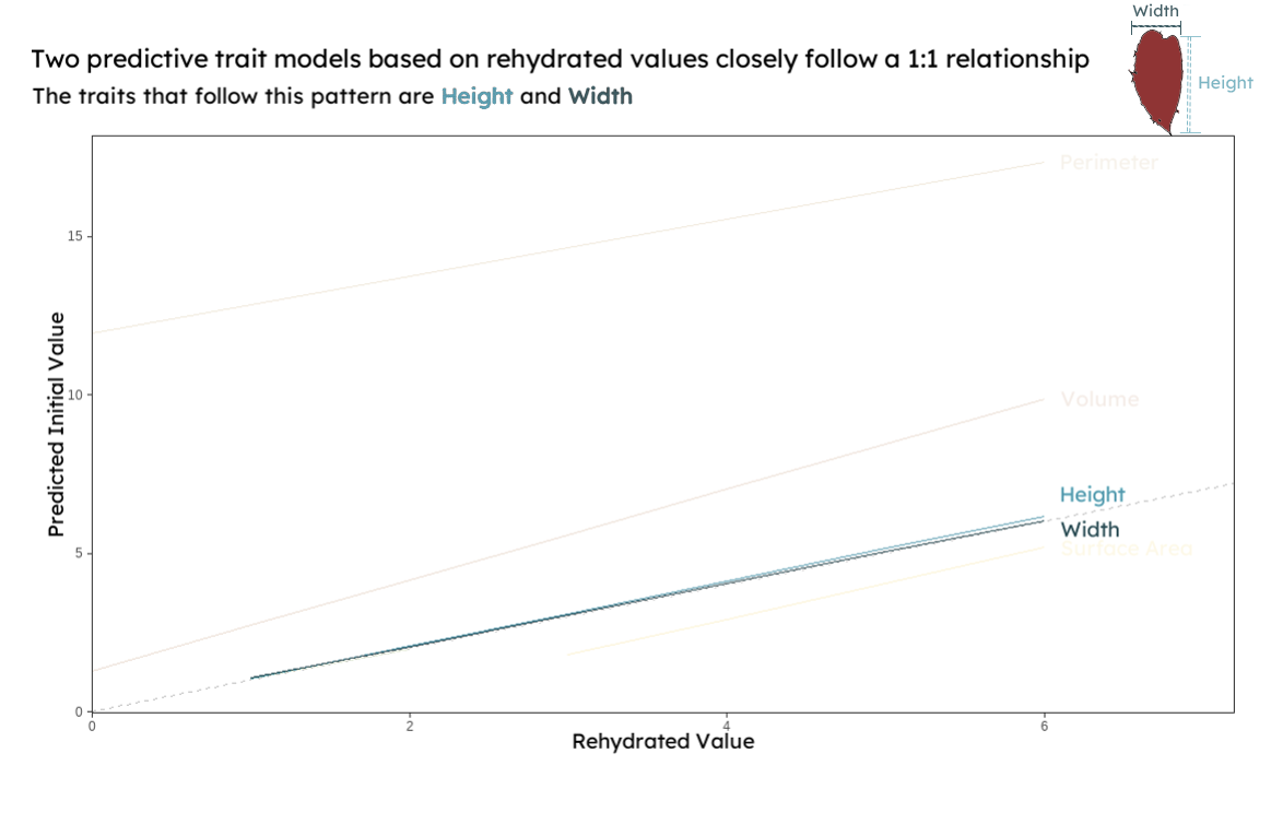 {group="finalviz" description="A line graph displaying linear models that predict initial functional trait measurements based on rehydrated preserved seaweed. The models for height and width are highlighted to show that they closely follow a 1:1 relationship between initial and rehydrated measurements"}